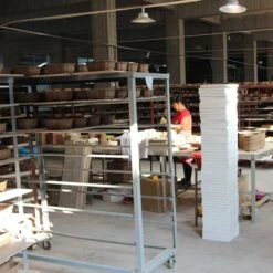 Herstellungsverfahren: Flüssiger Ton wird in eine Gipsform gepresst. Dadurch entsteht ein sehr akurater Grundkörper, der nach dem Trocknen im Gasofen bei ca. 1150-1200°C gebrannt wird.