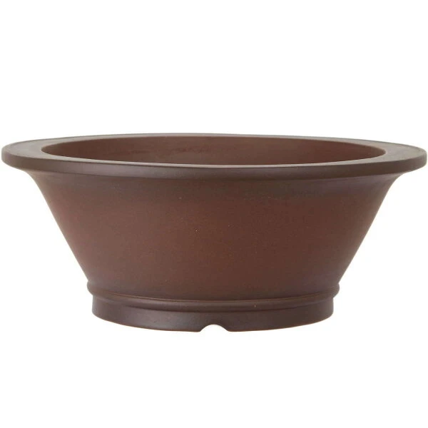 Bonsaischale (unglasiert, antik-braun, rund), handgemacht, in den Abmessungen: 29.5cm Länge, 29.5cm Breite, 11cm Höhe.