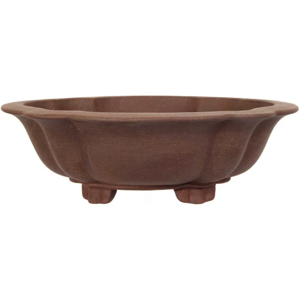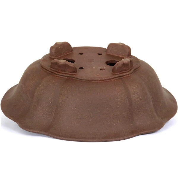 Bonsaischale (unglasiert, braun, lotusförmig), handgemacht, in den Abmessungen: 39cm Länge, 35cm Breite, 12.5cm Höhe.