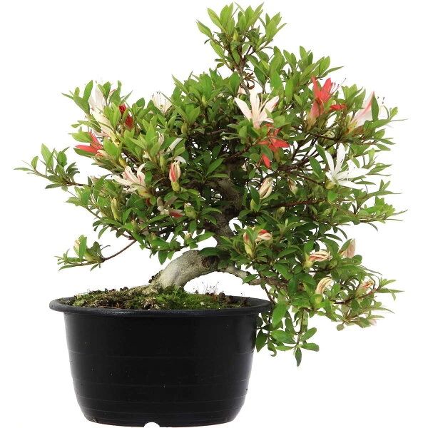 18 Jahre alte Japanische Satsuki Azalee (Sorte: Sachin) in einer Kunststoff Bonsaischale. Dieser Bonsai ist ca. 30cm hoch und wurde aus einer japanischen Bonsaigärtnerei importiert.