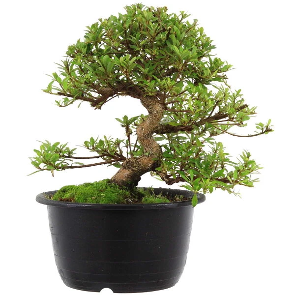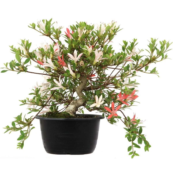 18 Jahre alte Japanische Satsuki Azalee (Sorte: Sachin) in einer Kunststoff Bonsaischale. Dieser Bonsai ist ca. 32cm hoch und wurde aus einer japanischen Bonsaigärtnerei importiert.